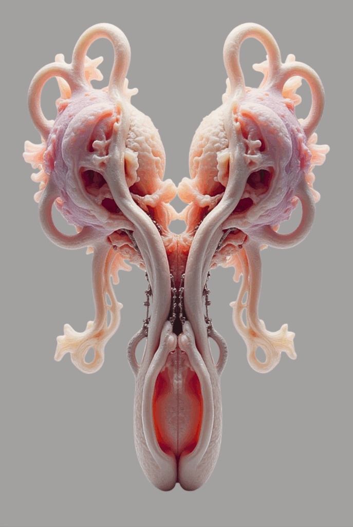 Integrating cyber-feminism, queer ecology, and crip poetics, Exquisite Machines for Making Anything But Children is a speculative counter-anatomy conceived by Eva Grant for healing following her miscarriage. In a society obsessed with viability, this series cuts the cord between reproduction and utility, repositioning the womb not as a site of extraction, but rather an incubator of autonomy. Midwifing refusal, Exquisite Machines do not produce children; they are a surrogate for futures the world is not yet equipped to carry.